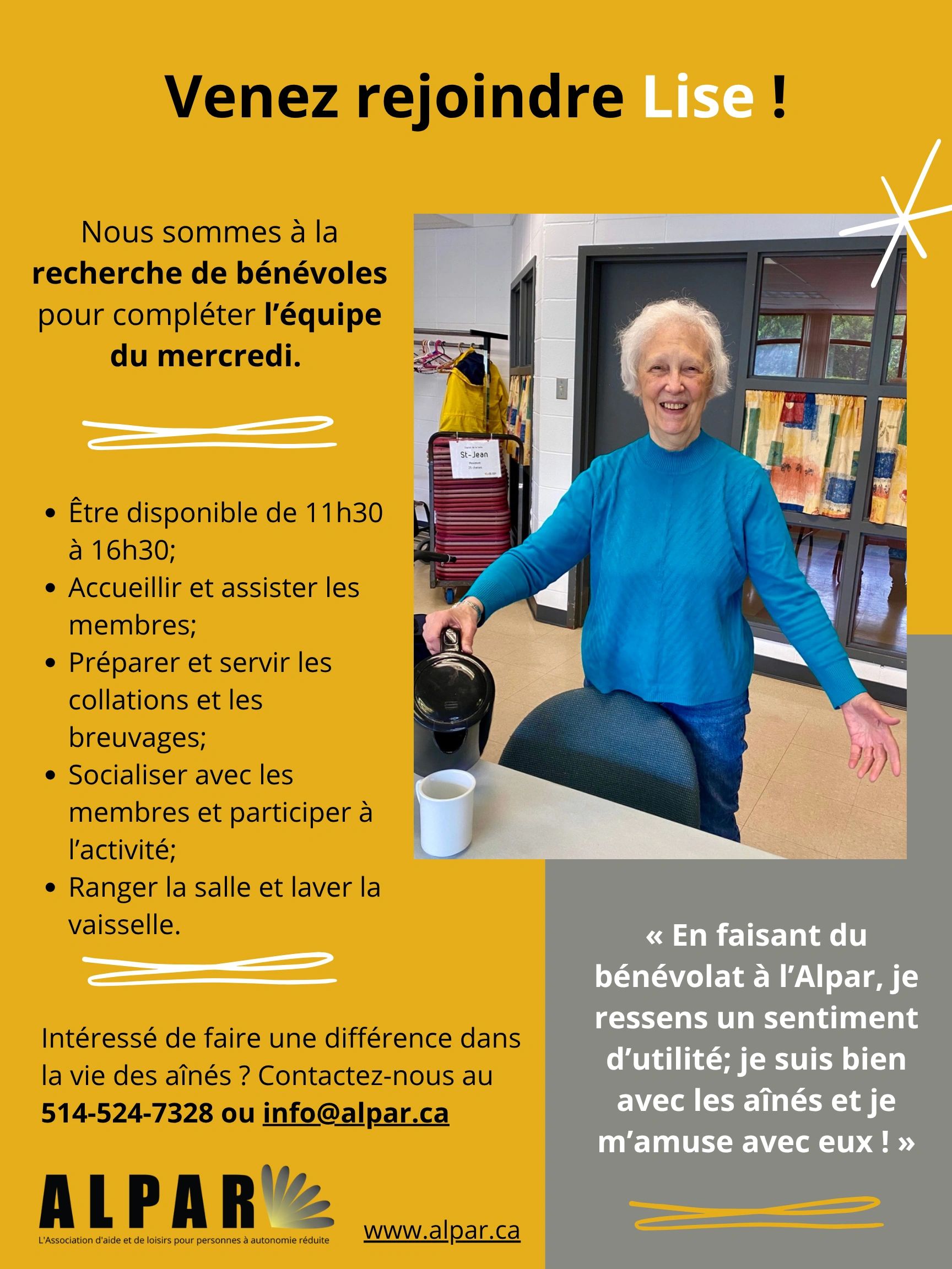 Pour devenir bénévole à l’Alpar : 514 524-7328 ou info@alpar.ca